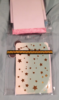 I tried to glue a glass button on top of my banners, but it just wouldn't stay. I tried hot glue and then goop, but I don't know if it was the button or the tape. So, I just sent the button with the package. I saw this stamp in someone's haul video awhile back and wished I had it, only to find it when I was packing up. I believe someone sent it to me in a swap. It's great, I love owls and I love books, what could be better? I actually have a pair of earrings that almost looks like it, only my earrings have an open book below the owl. The flip flops are sticky notes, so I stuck a little stack on there.