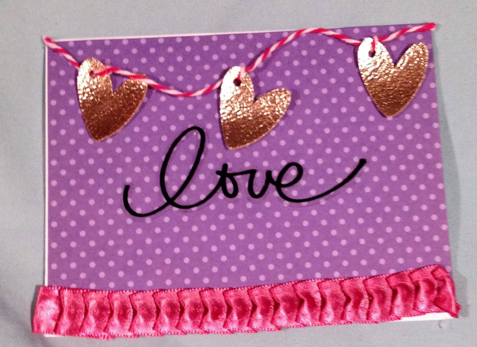 I like how it turned out. The hearts are actually the faux leather hearts from the tags at Target Dollar spot, I just strung them on some twine and glued them down. The trim I picked up at a garage sale last summer. The 'love' piece is just a piece of acetate I got it in an ArtC collage kit, I thought it was a sticker.