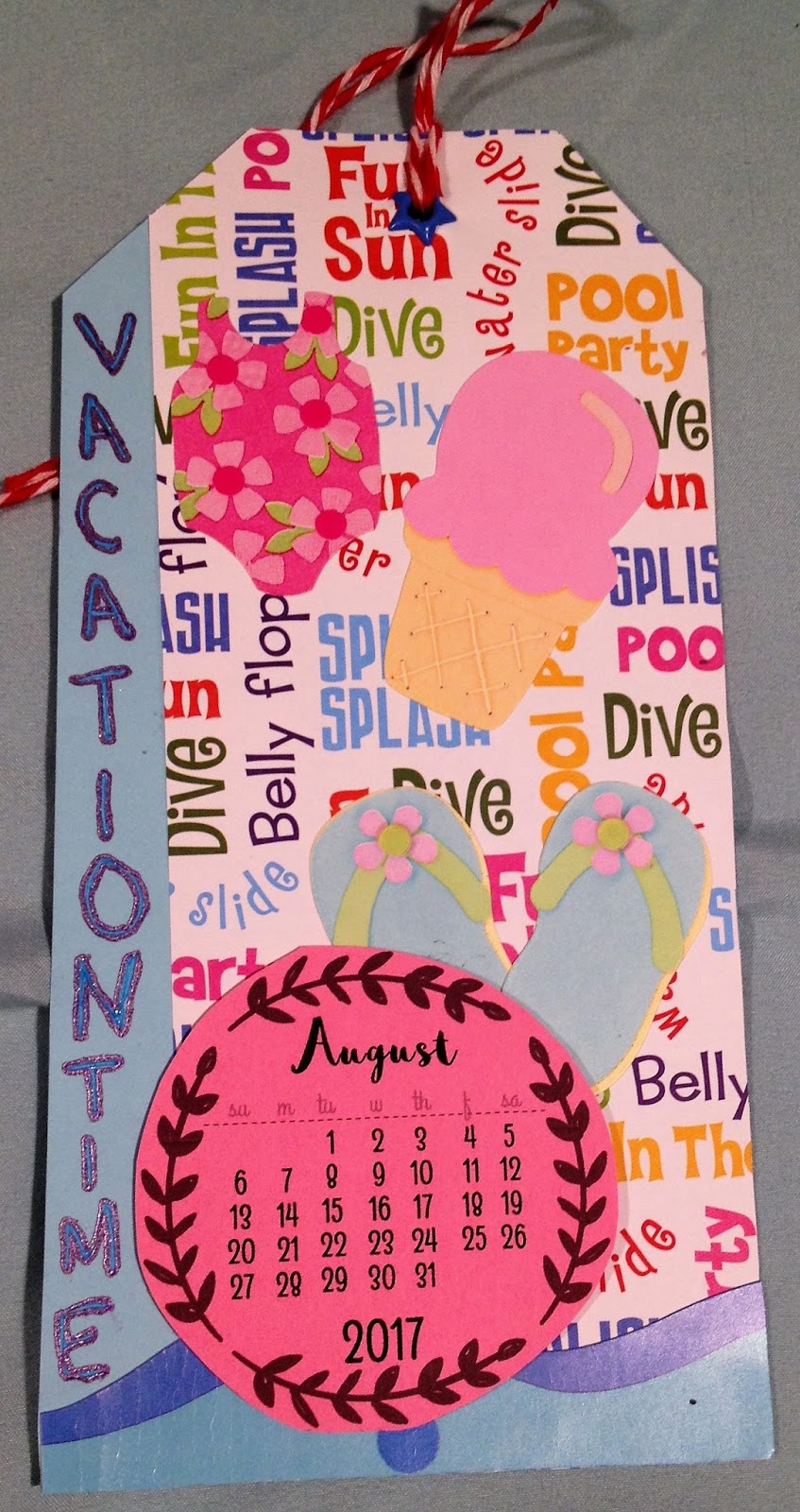 I used some teal wood grained paper for the background. I added the teal pearls to the top. The starfish is from a swap, I put a blue eyelet on it with some fiber for the string. The starfish at the bottom are from a sticker sheet from Hobby Lobby. I didn't like any of my mermaid stickers, they were too cartoony, so I made my own. I started with the fish scale looking paper and made a tail and then went on a hunt for a picture that fit the tail. In hindsight, I should have found a picture first and then made the tail. She was holding a child, so I cut out the child and part of her arm, I put some 3D flowers to cover her arms. I have an orange egg as her chair and then I found this 'rock' (I don't know what it is) it was in my stash and liked that as her chair better. She still didn't look like a mermaid to me, so I added the sequin 'crown'.We had to have texture and something shiny. I feel my rock works for the texture, and the sequin crown works for the something shiny.